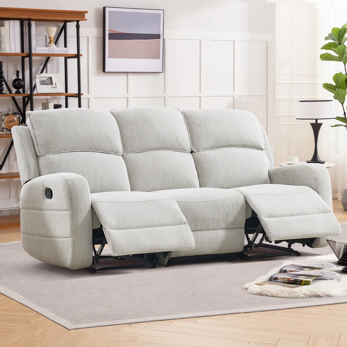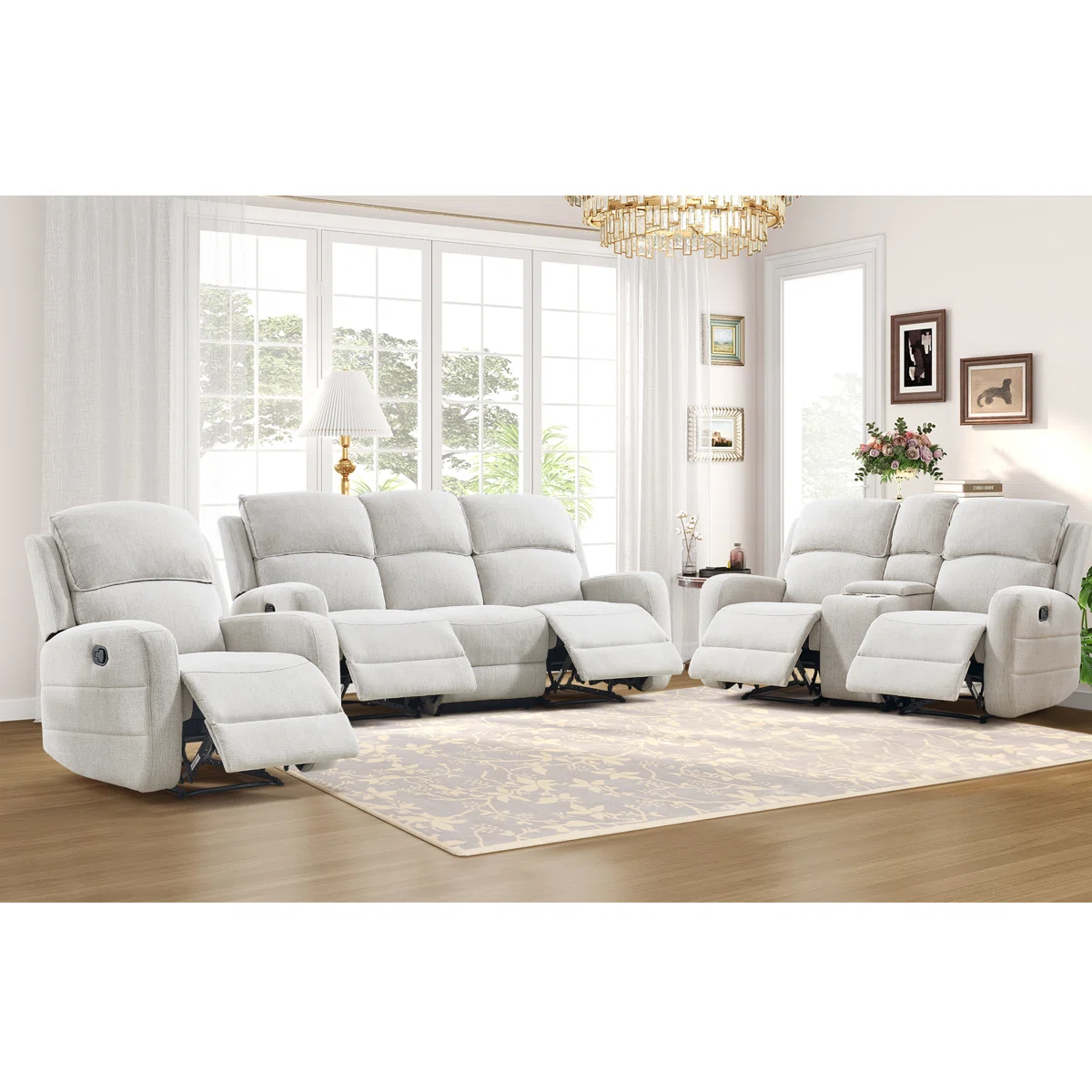 This 3-piece modern and comfortable living room set includes a manual reclining recliner, a loveseat with a center console, and a sofa, all crafted from a high-quality polyester blend fabric. Designed for ultimate comfort, the overstuffed cushions on each piece provide a soft and supportive seating experience, perfect for lounging, reading, or watching TV. This set features a manual reclining function, allowing you to easily adjust to your preferred angle of relaxation. The loveseat comes with a convenient center console, offering additional storage space and two built-in cupholders for ultimate convenience. This set seamlessly combines style and practicality, making it a perfect addition to any living room, offering comfort, functionality, and a touch of sophistication.