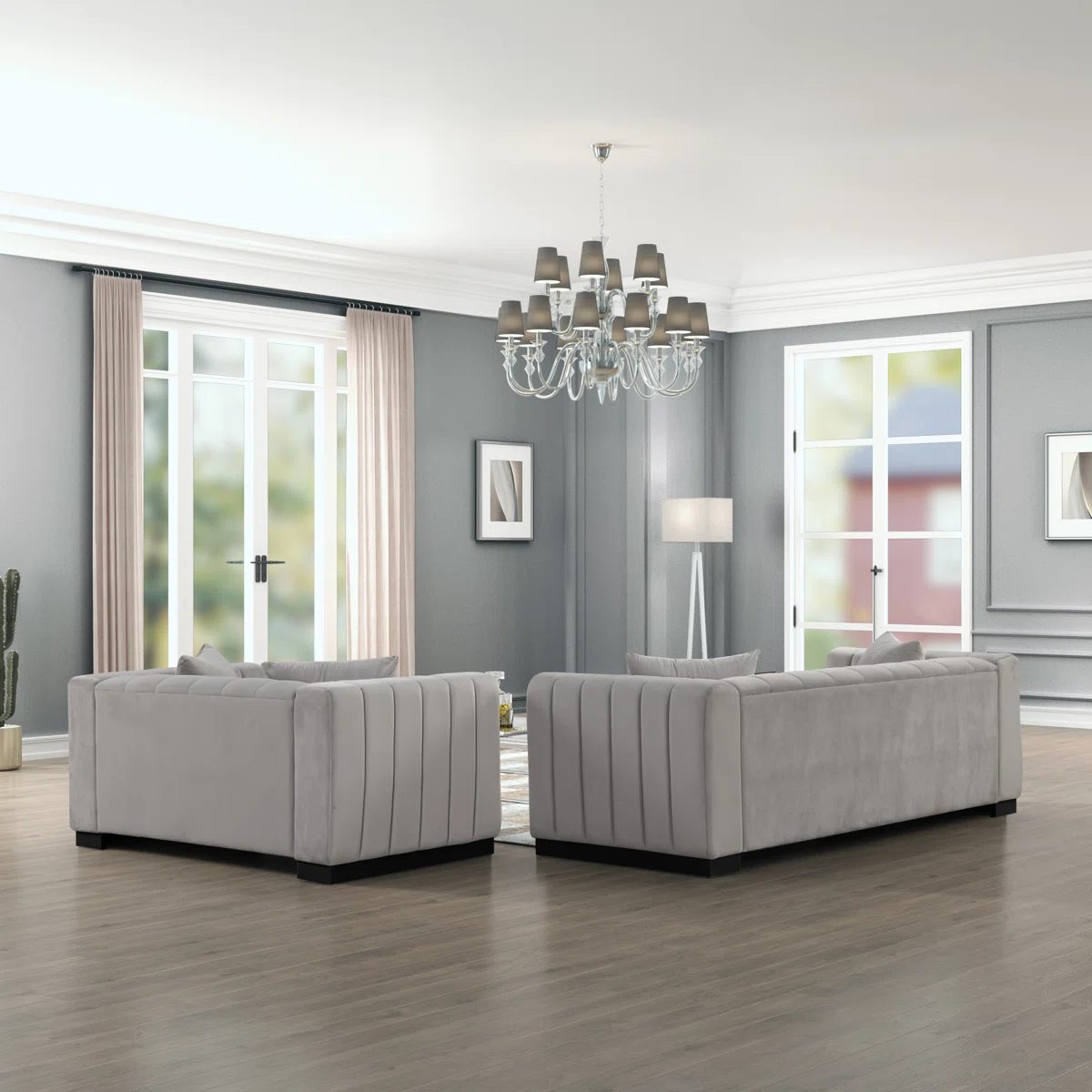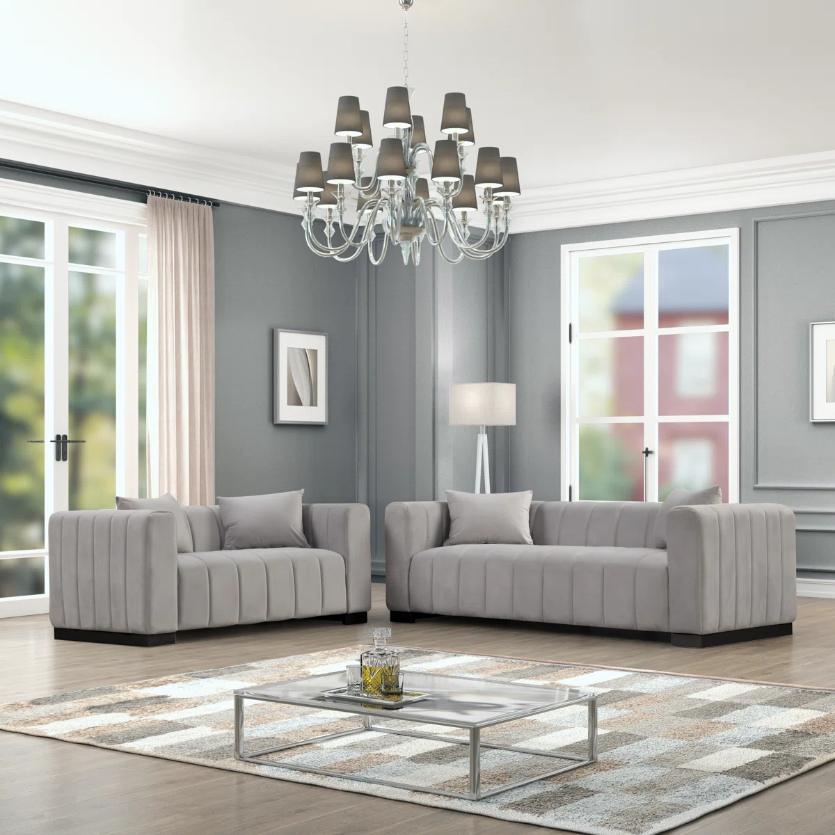 This 2-piece living room furniture set includes a large three-seater sofa and a smaller loveseat, completing your main hangout spot with lots of glam style. Each piece has a solid and engineered wood frame that rests on a black-finished plinth base, forming a sturdy, supportive structure. Luxe velvet upholstery surrounds the frame as vertical channels create a dynamic look we love. This duo is generously padded with foam for just-right support as you lie back and unwind. Four toss pillows come with this set for another layer of comfort.
