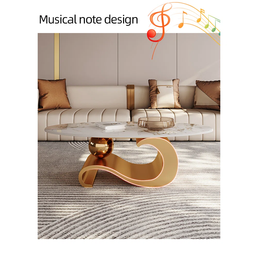 Elevate your living room with this luxurious oval coffee table, featuring a glossy white sintered stone top and a stunning musical note base. Its sleek design effortlessly blends modern style with artistic flair, making it the perfect centerpiece for contemporary spaces. Crafted for durability and elegance, this table adds a touch of sophistication to any home décor.